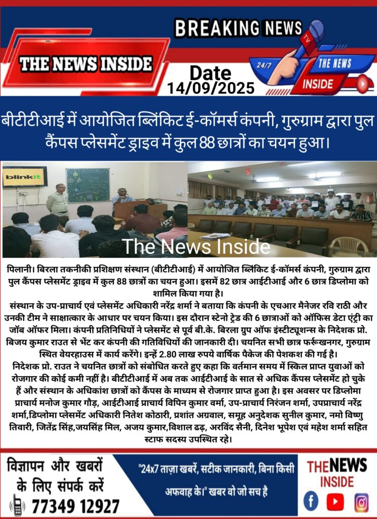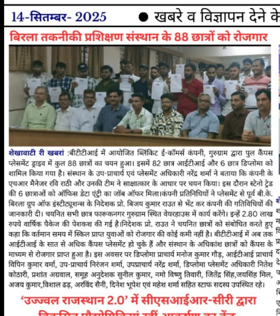 बिरला आईं टी आई पिलानी के 82 छात्रों को मिला रोजगार