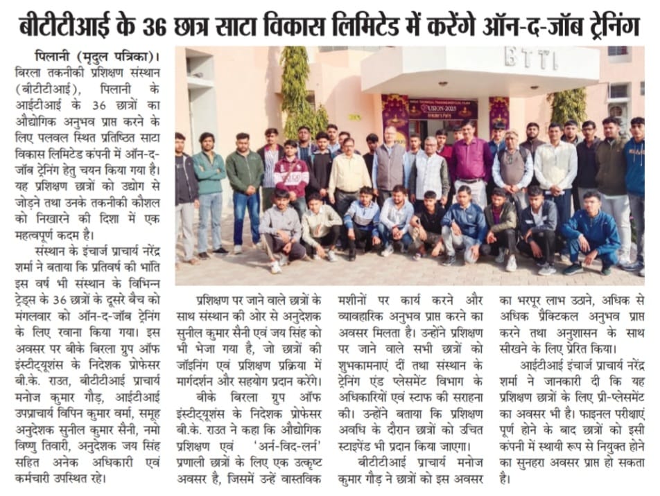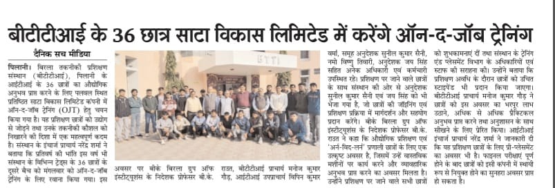 बिरला तकनीकी प्रशिक्षण संस्थान (बीटीटीआई), पिलानी के आईटीआई के 36 छात्रों का औद्योगिक अनुभव प्राप्त करने के लिए पलवल स्थित प्रतिष्ठित साटा विकास लिमिटेड कंपनी में ऑन-द-जॉब ट्रेनिंग (OJT) हेतु चयन किया गया है। यह प्रशिक्षण छात्रों को उद्योग से जोड़ने तथा उनके तकनीकी कौशल को निखारने की दिशा में एक महत्वपूर्ण कदम है।